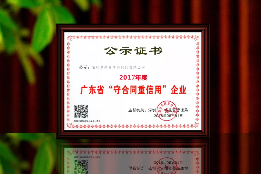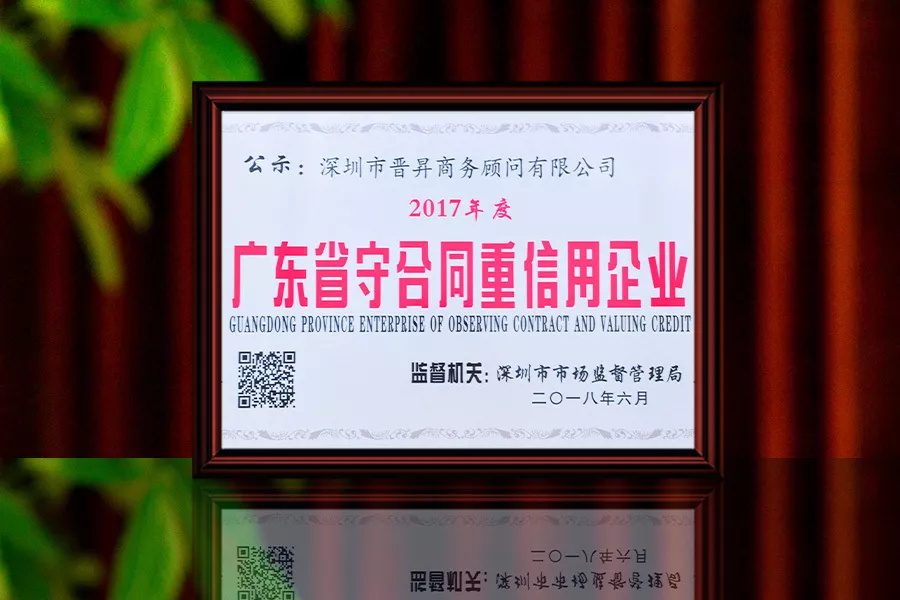 繽紛夏日,總有不斷的驚喜到來。近期,深圳市市場監(jiān)督管理局對2017年度廣東省“守合同重信用”企業(yè)進行公示,晉昇國際榮獲2017年度廣東省“守合同重信用”企業(yè),并獲頒榮譽牌匾和榮譽證書。這是令人欣喜和鼓舞人心的時刻,晉昇國際團隊將繼續(xù)砥礪前行,為廣大客戶創(chuàng)造價值!