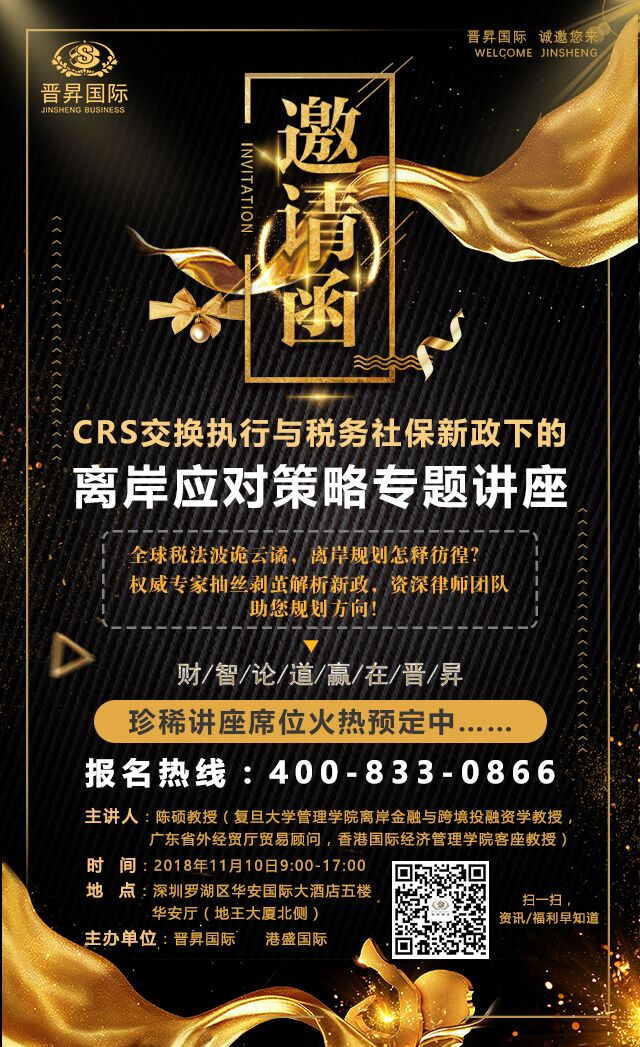 2018年10月23日,港盛國際、晉昇國際攜手恒生銀行及承以信律師事務所在上海成功舉辦了《后CRS時代的離岸資產(chǎn)稅務規(guī)劃與安全保障暨中國香港投資優(yōu)勢&貿(mào)易融資》高端專題講座,現(xiàn)場三位專業(yè)講師為客戶分別講述中國香港投資的優(yōu)勢以及銀行的角色定位、中國香港恒生銀行貿(mào)易融資介紹及后CRS時代與稅改新政下,離岸資產(chǎn)稅務規(guī)劃與安全保障的新策略等精彩內(nèi)容。