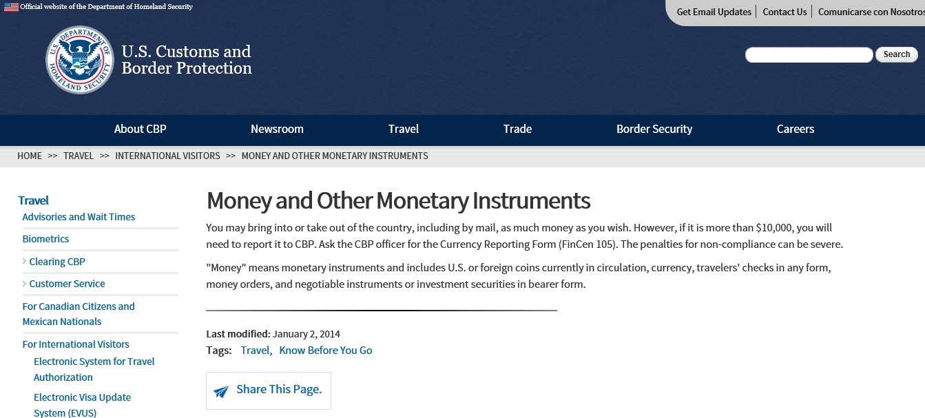 美國(guó)海關(guān)及邊境保護(hù)局(CBP)規(guī)定,游客攜帶超過(guò)1萬(wàn)美元現(xiàn)金、旅行支票或者其它貨幣等,都須向海關(guān)申報(bào),并對(duì)現(xiàn)金的來(lái)源作出合理解釋?zhuān)绗F(xiàn)金如果來(lái)自所出售房產(chǎn),務(wù)必出示出賣(mài)房產(chǎn)的憑據(jù)等。如不申報(bào),當(dāng)事人最高可面臨50萬(wàn)美元的罰款及10年以上有期徒刑。