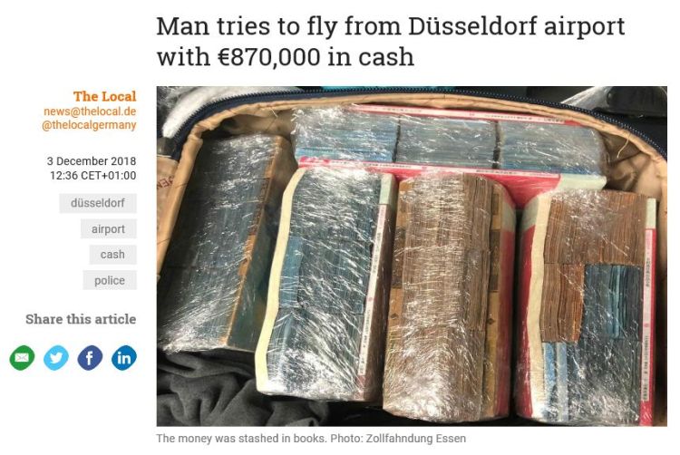 據(jù)德國(guó)海關(guān)當(dāng)局稱(chēng),近期在德國(guó)西部Dusseldorf機(jī)場(chǎng),一名安檢人員發(fā)現(xiàn)一名26歲華人登機(jī)時(shí),箱內(nèi)的物品異常,隨即要求開(kāi)箱檢查,經(jīng)工作人員檢查發(fā)現(xiàn),箱內(nèi)有87萬(wàn)歐元現(xiàn)金均被該華人偽裝成中文書(shū)籍,試圖攜帶離境。