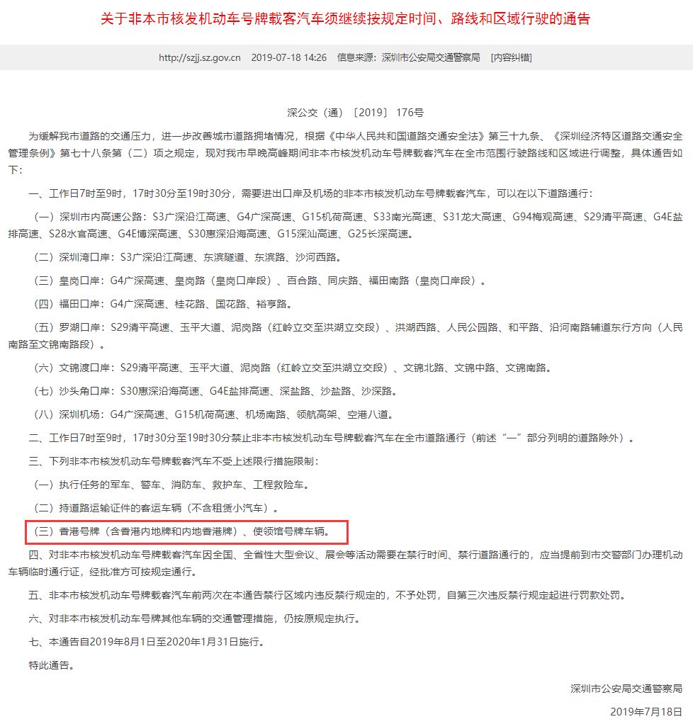 2019年1月18日,深圳市公安局交通警察局在其官網(wǎng)發(fā)布《關(guān)于非本市核發(fā)機(jī)動車號牌載客汽車須繼續(xù)按規(guī)定時間、路線和區(qū)域行駛的通告》。