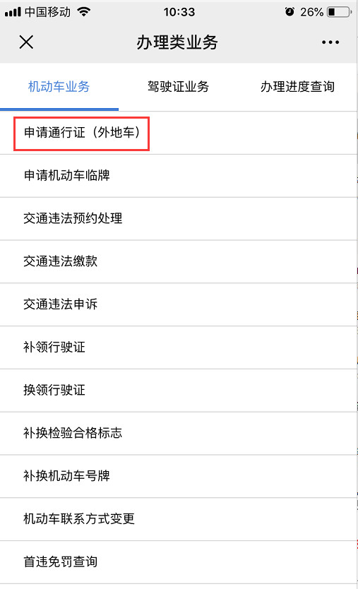 關(guān)注公眾號【深圳交警】點(diǎn)擊【星級用戶】進(jìn)入頁面,然后點(diǎn)擊【辦理類業(yè)務(wù)】,進(jìn)入后點(diǎn)擊【申請通行證(外地車)】即可申請。