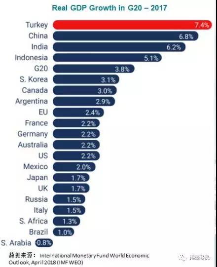 2003年-2017年,土耳其經(jīng)濟(jì)經(jīng)歷了15年的高速發(fā)展。在2017年OECD對(duì)G20成員國(guó)GDP實(shí)際增速的統(tǒng)計(jì)中,土耳其以7.4%的增速位列之首。2018年GDP排名18,超過瑞士(20)和中國(guó)香港(35)