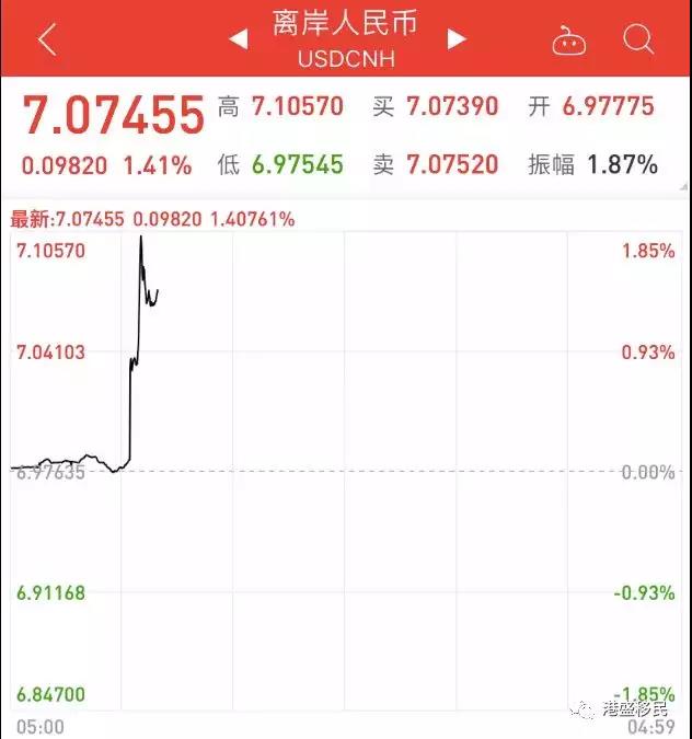 昨日(8月5日)上午九點(diǎn)十六分左右,離岸美元兌人民幣跌破7關(guān)口,最高報(bào)7.1057。到了9點(diǎn)32分左右,在岸人民幣兌美元匯率也跌破7關(guān)口,最高報(bào)7.0424。