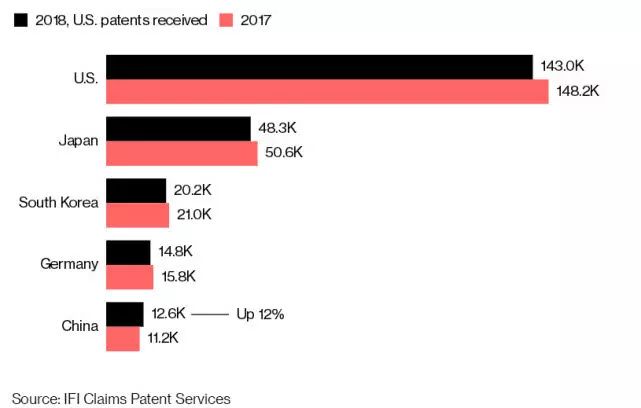 從全球國(guó)家總體來(lái)看,美國(guó)專利局商標(biāo)局去年授予的專利數(shù)量下降了3.5%,除中國(guó)外,其他主要國(guó)家獲得的專利數(shù)量都低于上年。在2018美國(guó)專利排行榜中,中國(guó)專利數(shù)量增一成,排全球第五。