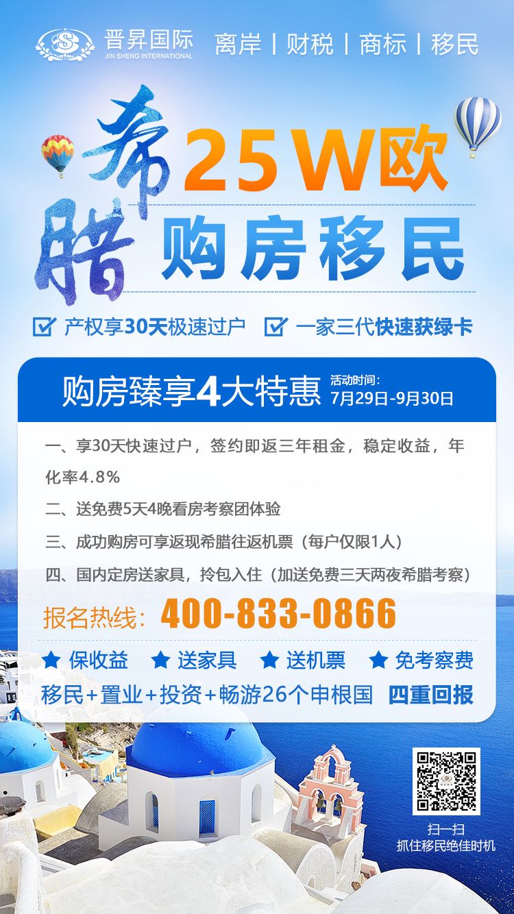 目前,25萬歐元希臘購(gòu)房移居以其性價(jià)比高,申請(qǐng)簡(jiǎn)單等優(yōu)勢(shì),成為歐洲投資移居的優(yōu)選。越來越多的申請(qǐng)人以投資,子女教育,跳板歐美,資產(chǎn)配置或移居養(yǎng)老為目的來到希臘并愛上希臘。通過希臘購(gòu)房移居項(xiàng)目,還能擁有希臘永久產(chǎn)權(quán)的房產(chǎn),享受經(jīng)濟(jì)復(fù)蘇帶來的房產(chǎn)增值紅利!不僅可以全家獲得歐盟身份,而且可以通行申根26國(guó)、方便貿(mào)易經(jīng)商、孩子還可以享受歐洲免費(fèi)教育,低費(fèi)就讀英美高校。