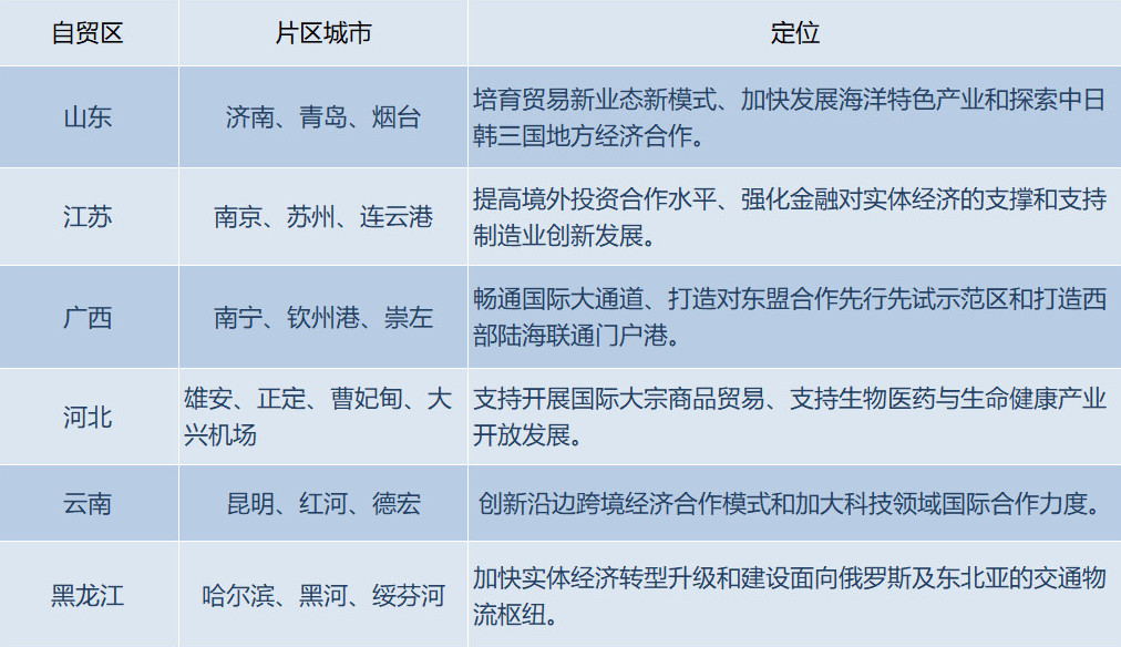 8月26日,國務院印發(fā)《中國(山東)、(江蘇)、(廣西)、(河北)、(云南)、(黑龍江)自由貿(mào)易試驗區(qū)總體方案》。8月30日,6個新設自貿(mào)試驗區(qū)正式掛牌成立。隨著山東、江蘇、河北新設自貿(mào)區(qū),我國沿海省份自貿(mào)區(qū)實現(xiàn)全覆蓋;而廣西、云南、黑龍江新設自貿(mào)區(qū),則讓自貿(mào)區(qū)在沿邊地區(qū)首次落地生根。