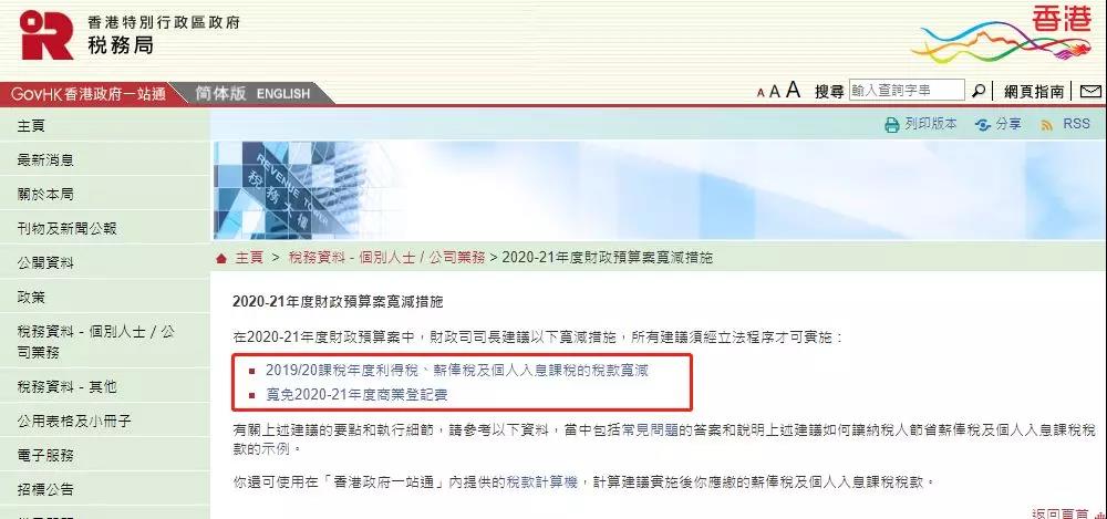 2019/20課稅年度利得稅、薪俸稅及個(gè)人入息課稅的稅款寬減;