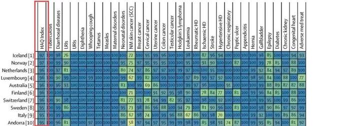《柳葉刀》將HAQ指數(shù)分為十個等級,其中紫色部分為高等級。