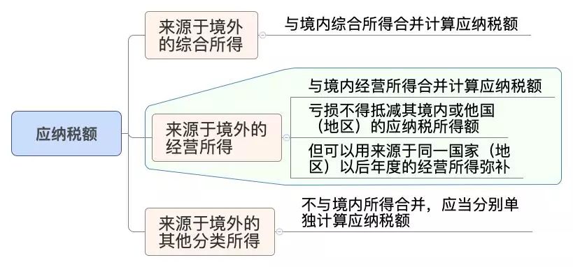 注:分類所得是比例稅率,不用和境內(nèi)所得合并,綜合所得和經(jīng)營所得是累進稅率,應(yīng)把境內(nèi)外合并計算出一個整體的應(yīng)納稅額。